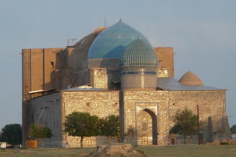 Parmi les jolis moments, il y eut cette étape à Turkistan où se trouve le mausolée du maître soufi Khoja Ahmed Yasavi; un mausolée des 12è puis 14è siècle avec son dôme qui est le plus grand d’ Asie centrale ; un mausolée (voir photo) qui a été le premier site kasakh inscrit par l’ UNESCO au patrimoine mondial.