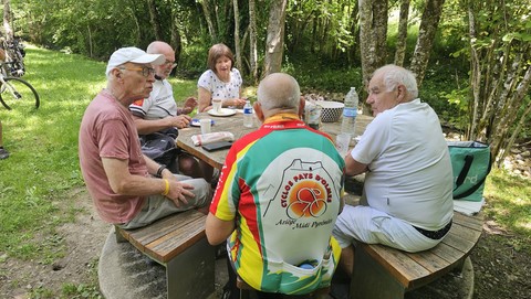 L’accueil fut à la hauteur du cadre exceptionnel, grâce à l’équipe de Foix Cyclo et du Codep. Une table généreusement garnie de gâteaux et de boissons fraîches nous attendait. Après de chaleureuses discussions, les cyclos sont repartis en emportant avec eux de précieux souvenirs de ces moments conviviaux.